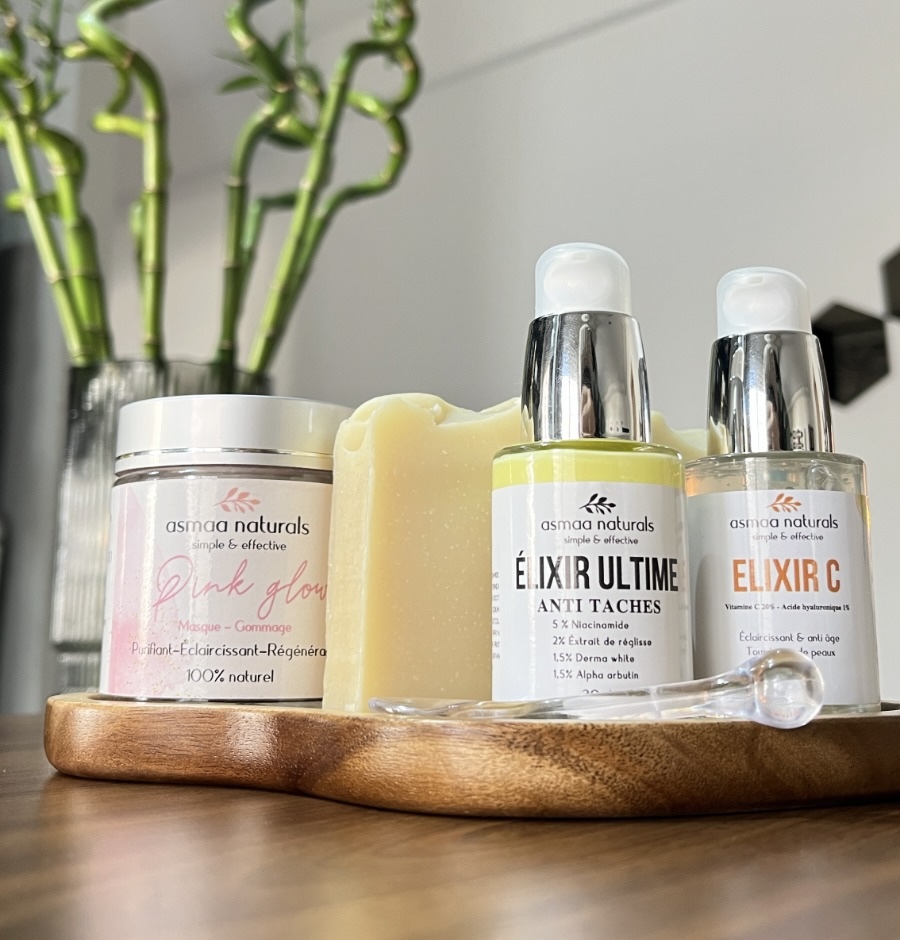 La Gamme Anti imperfections  de asmaa naturals a été spécialement formulée pour répondre aux besoins des peaux mixtes à grasses, irritées (acné, rosacée , eczéma , dermite séborrhéique... ) et sujettes aux imperfections et aux excès de sébum. Grâce à une synergie d'actifs purifiants et régulateurs, nos soins naturels et bio nettoient en profondeur et rééquilibrent la peau, tout en la respectant. Les produits de cette gamme aident à réduire les imperfections, resserrer les pores et améliorer la texture de la peau, pour un teint net et clarifié. Élixir Détox : Ce sérum ultra-concentré est formulé à base de neem ,tea tree  et ortie piquante pour réguler la production de sébum. Il aide à réduire les pores dilatés et à diminuer les imperfections (points noirs, boutons) tout en apaisant les inflammations. Sa texture légère pénètre rapidement, laissant la peau matifiée et purifiée. Utilisé quotidiennement, il révèle une peau plus saine, lisse et équilibrée. Hydrolat de lavande : à l'odeur  rafraîchissante et apaisante  l'hydrolat de lavande aide à tonifier et rééquilibrer la peau après le nettoyage. Appliquée matin et soir, elle prépare la peau à recevoir vos soins et aide à resserrer les pores pour un teint net et clarifié. Le savon au lait de chèvre : nettoie en profondeur la peau et élimine les impuretés sans agresser la peau , il régule l'excès de sébum et favorise la cicatrisation de la peau. Masque Pink Glow: Offrez à votre peau une exfoliation en profondeur avec note masque. Formulé avec des AHA et  vitamice C d'origine naturelle, ce masque purifie la peau, resserre les pores et affine le grain de peau. Utilisé une à deux fois par semaine, il élimine les cellules mortes, booste le renouvellement cellulaire et réduit l’apparence des imperfections. Résultat : une peau plus nette, lisse et éclatante de santé. La Gamme anti imperfections asmaa naturals  est l’alliée incontournable des peaux à imperfections , mixtes à grasses irritées ( acné, rosacée , eczéma , dermite séborrhéique... ) . En rétablissant l'équilibre naturel de votre peau, elle réduit les brillances tout en respectant son hydratation. Ces soins naturels et fabriqués en Maroc, sont formulés pour offrir une peau rééquilibrée et éclatante de pureté.